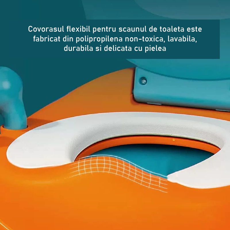 MATERIAL NON-TOXIC: Covorasul flexibil pentru scaunul de toaleta este fabricat din polipropilena non-toxica, lavabila, durabila si delicata cu pielea.