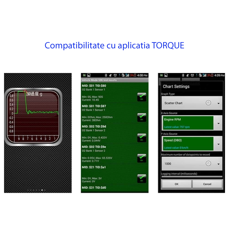 Aplicatii compatibile: Se recomanda aplicatiile Torque Pro, Torque Lite (gratuita), OBD Car Doctor (gratuita) etc., disponibile in Google Play. Functioneaza cu telefoane si tablete Android.