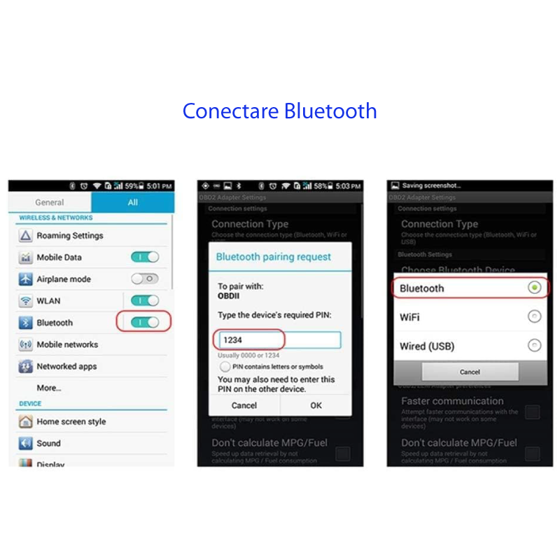 Conecteaza dispozitivul in portul OBD2 al masinii, porneste masina, activeaza Bluetooth-ul pe telefon sau tableta, cauta "OBDII" si conecteaza-te (codul PIN este 1234), apoi deschide aplicatia descarcata, seteaz-o simplu si asteapta conectarea la ECU-ul masinii. Daca folosesti acelasi OBD pe doua sau mai multe masini, trebuie sa deconectezi Bluetooth-ul si sa inchizi aplicatia dupa testarea unei masini, apoi sa refaci imperecherea Bluetooth cand il introduci in alta masina.
