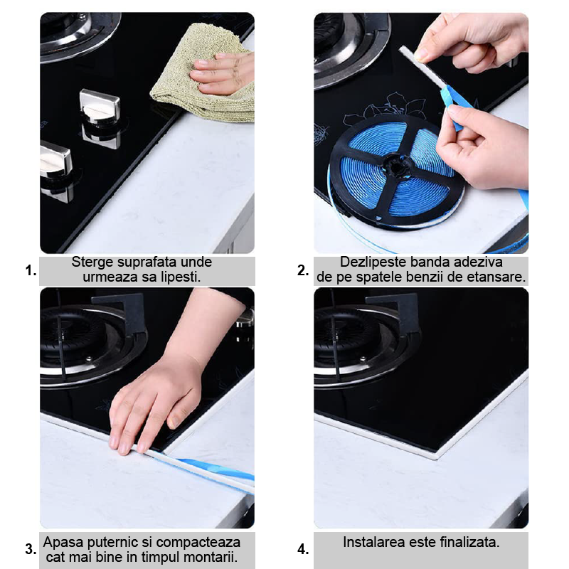 Banda flexibila autoadeziva are lipici aplicat, trebuie doar sa masori si sa tai lungimea dorita, apoi sa dezlipesti folia de pe spate si sa o aplici pe suprafete, margini sau colturi.