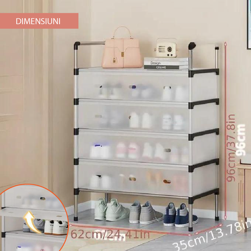 Este un suport pentru pantofi cu 5 nivele, 4 protectii impotriva prafului, un blat pentru chei si genti, un dulap pentru pantofi cu dimensiunile de 62 x 35 x 96 cm, pentru un maxim de 16 perechi de pantofi.