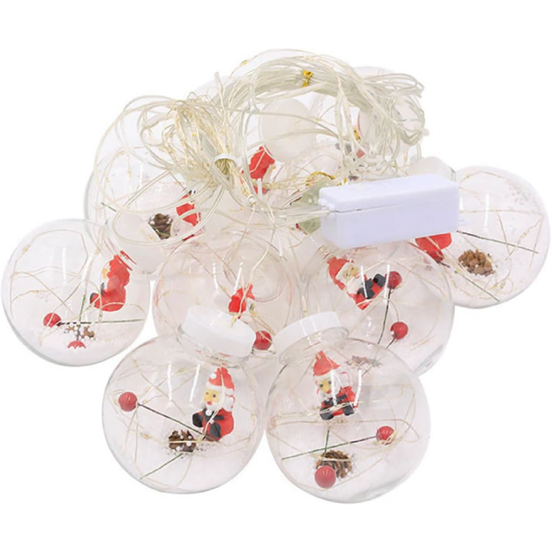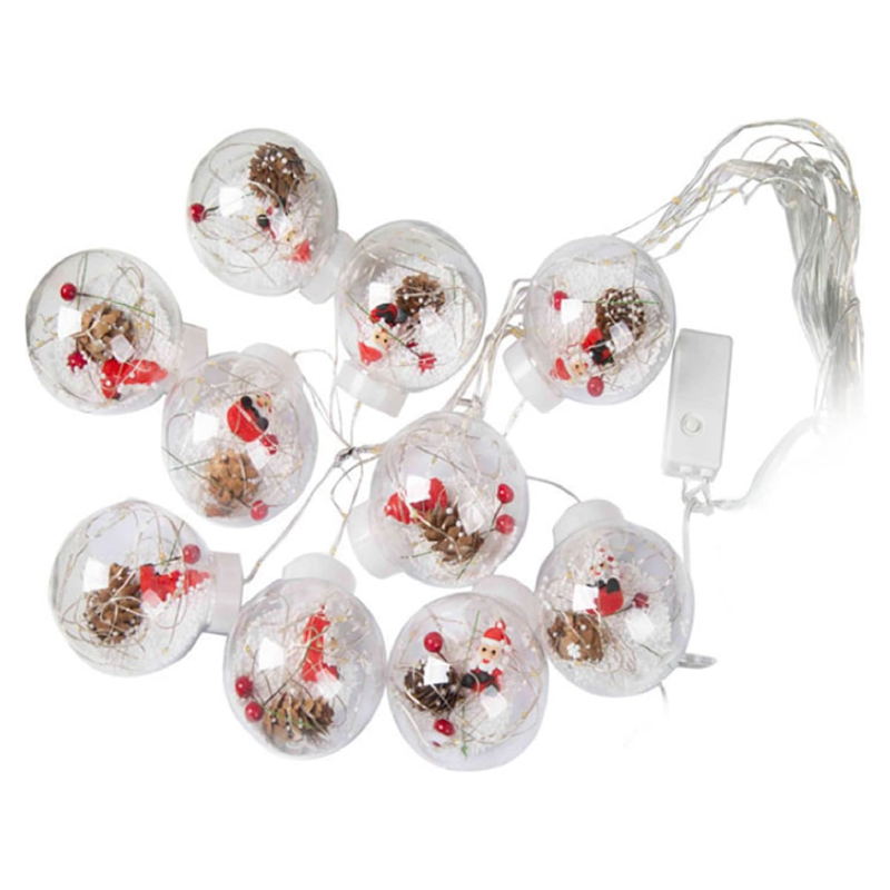 •    Contine 10 globuri decorative cu figurine de Craciun, zapada artificiala si conuri de brad.