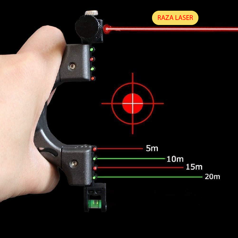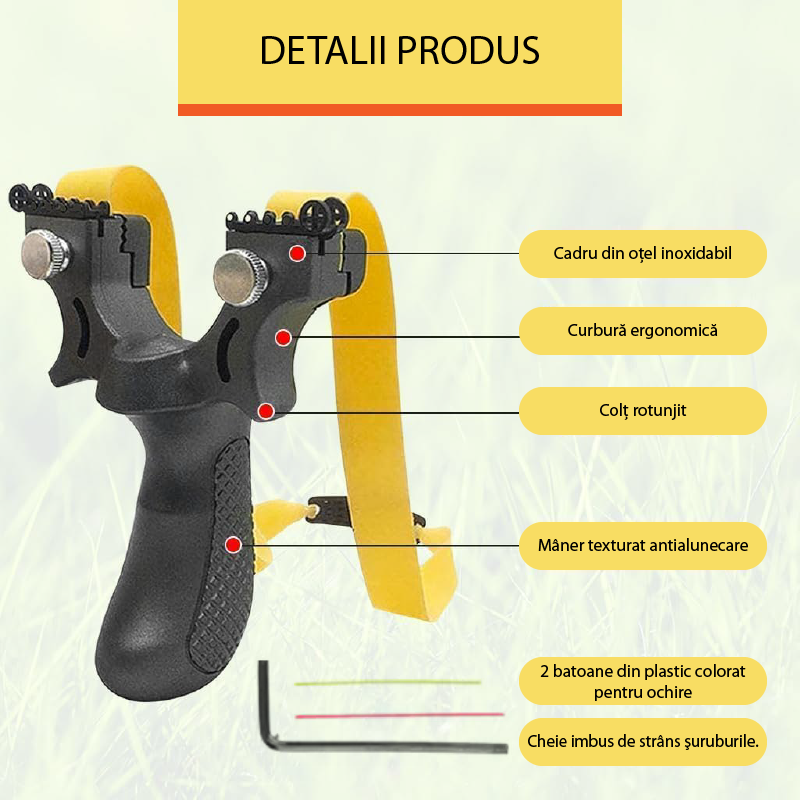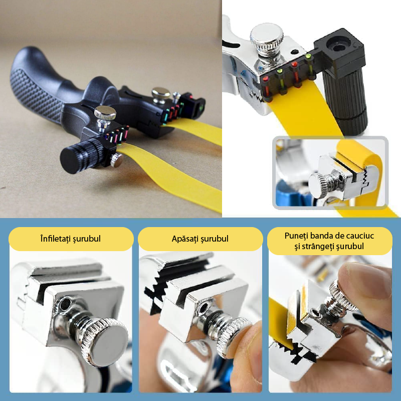 Latexul de lansare fixeaza foarte usor de corpul prastiei. Laserul si bolobocul va ajuta la o tintire cat mai exacta.