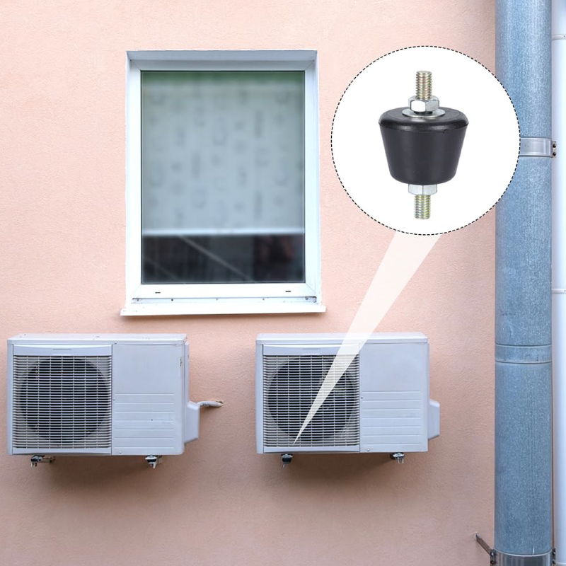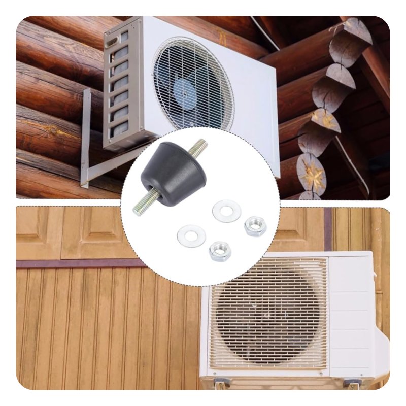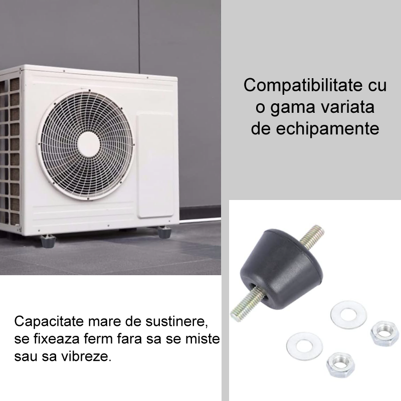 Instalare usoara: se trec suruburile prin gaurile picioarelor unitatii si apoi se strang piulitele suporturilor antivibratii. Setul este potrivit pentru majoritatea unitatilor exterioare de aer conditionat.