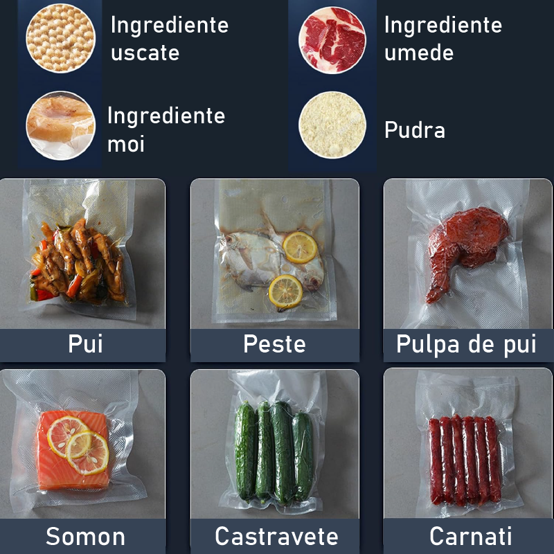• Functie de Sigilare Uscata si Umeda: Indiferent daca vrei sa sigilezi alimente uscate, cum ar fi cerealele, sau alimente umede, cum ar fi carnea marinata, acest aparat se adapteaza perfect.