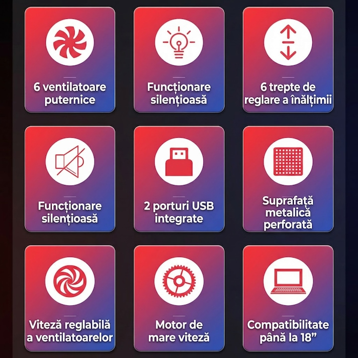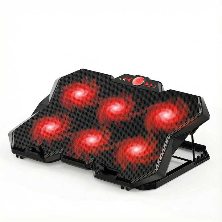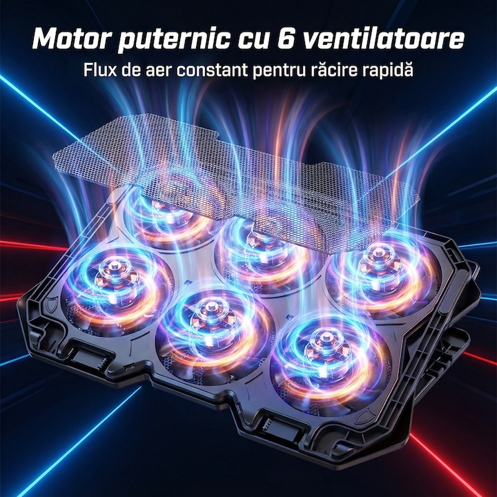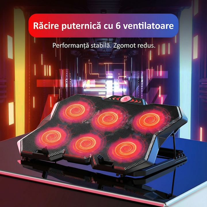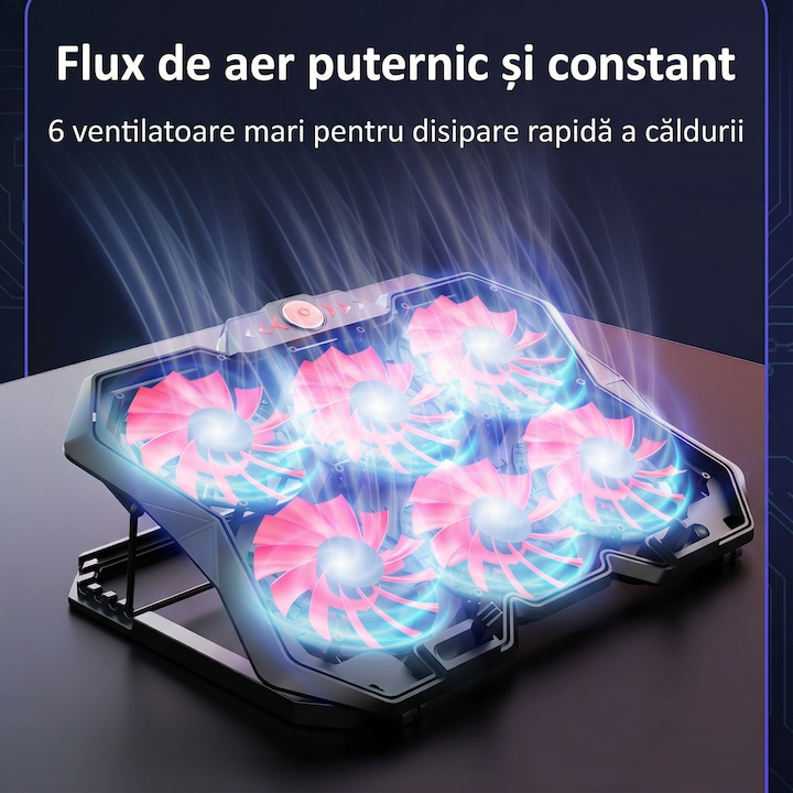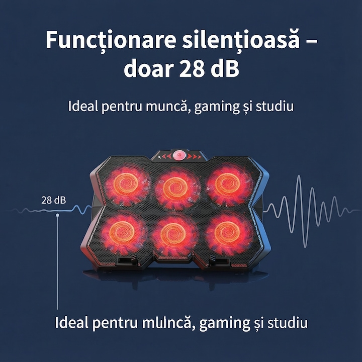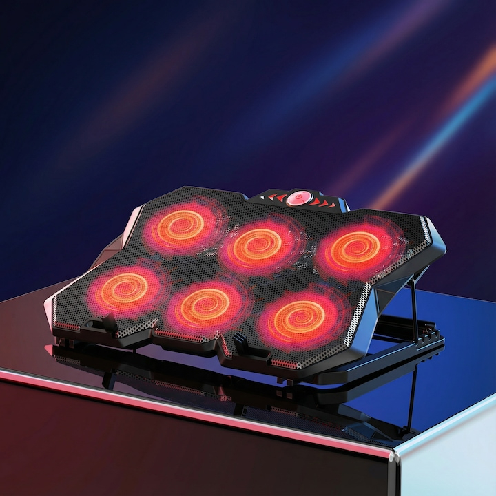Echipat cu 6 ventilatoare, coolerul asigura un flux de aer constant si uniform, contribuind la mentinerea temperaturii optime a laptopului chiar si in timpul utilizarii intense. Viteza reglabila a turatiilor permite adaptarea nivelului de racire in functie de necesitati, oferind flexibilitate si control sporit. Nivelul de zgomot redus, de aproximativ 28 dB, il face potrivit pentru medii linistite, fara a crea disconfort auditiv.