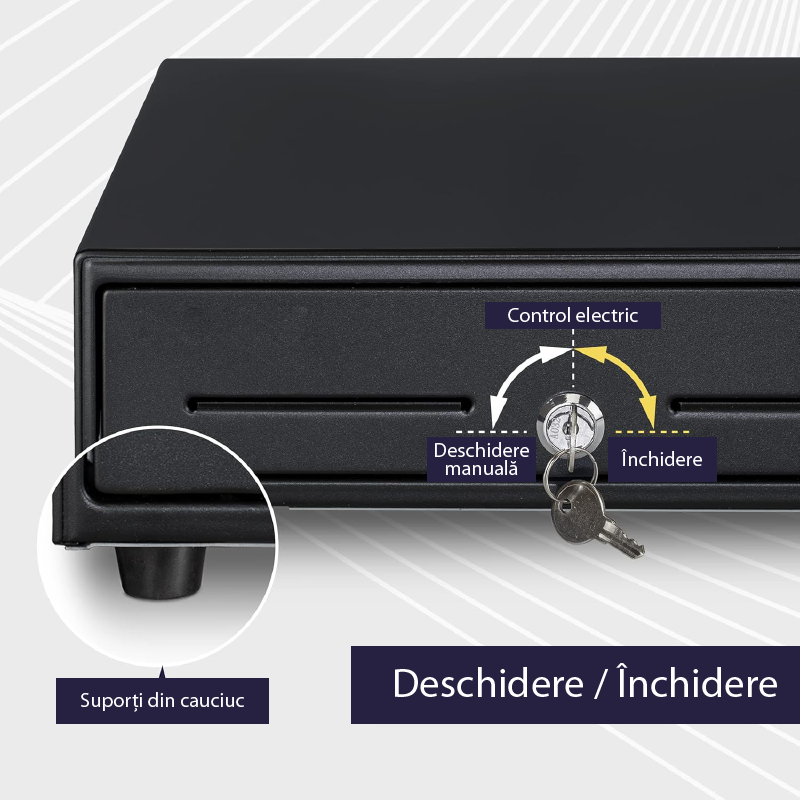 Sertarul de bani este dotat cu o incuietoare cu 3 pozitii: