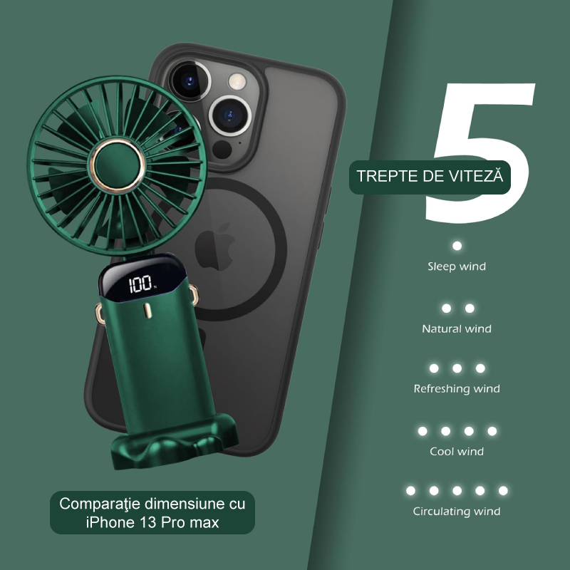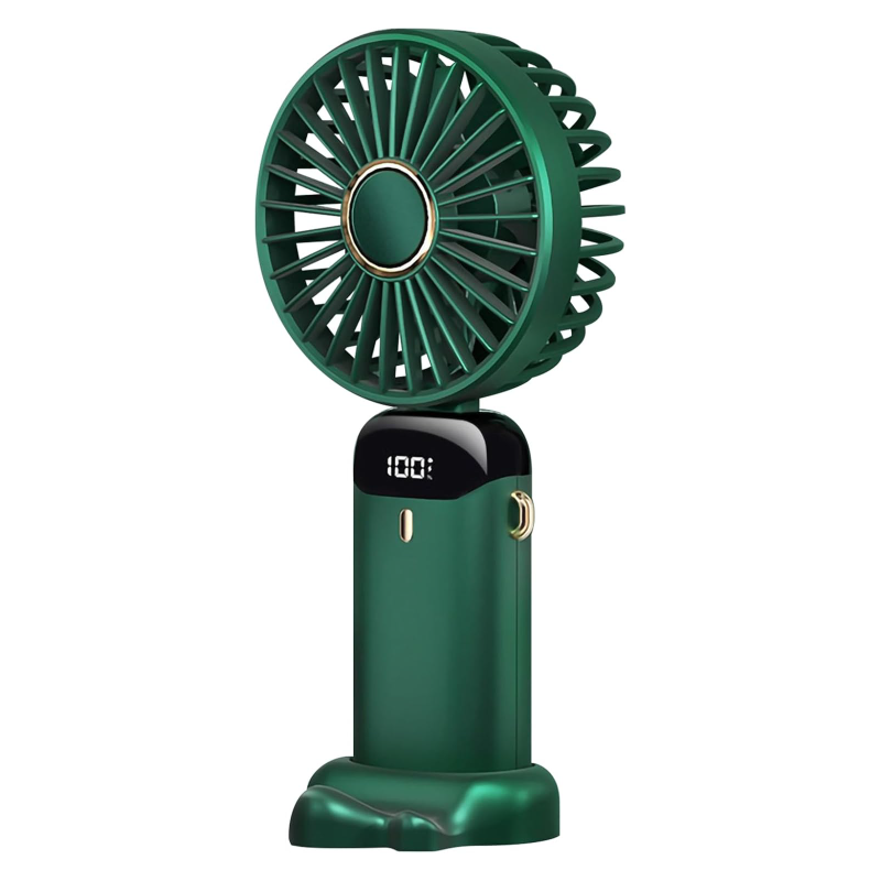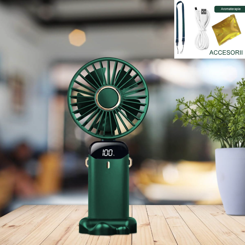 Ventilator Portabil Premium SUPER TRENDS®, 4 in 1, de Mana, de Birou, de Gat, cu Aromaterapie, 5 Trepte de Viteza, Incarcare USB, Autonomie 12h, Pliabil, cu Ecran LCD, Verde Inchis, Baterie de 4000 mA