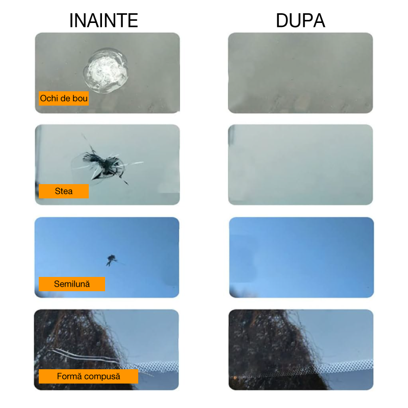 • Reparatii rapide si eficiente – Conceput pentru a repara fisuri mici, ciobituri in forma de stea, ochi de bou, crapaturi mici si alte deteriorari minore ale sticlei auto.
