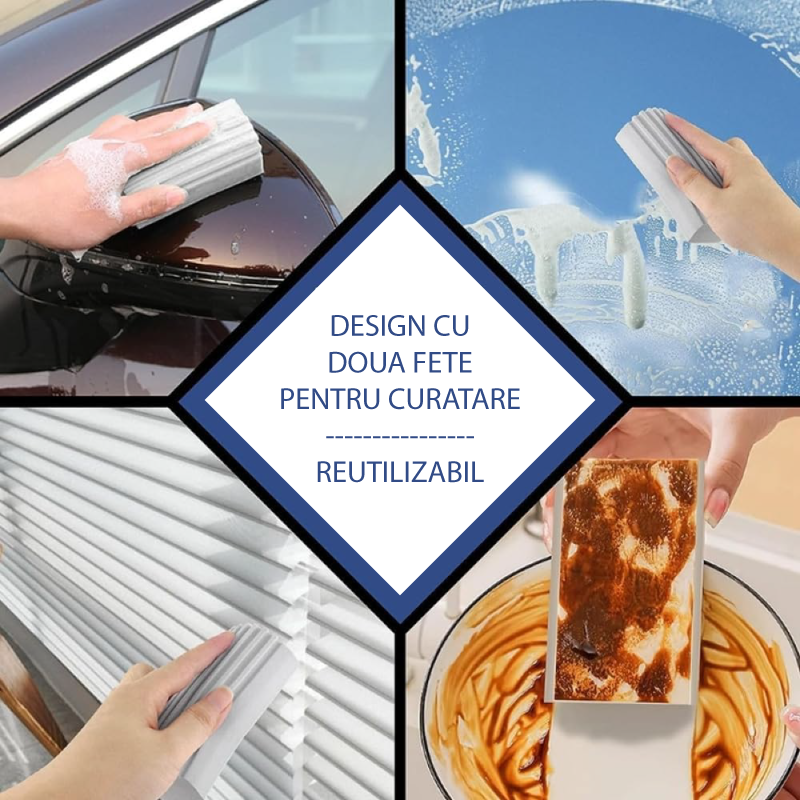 Utilizat in zone precum usi si jaluzele, plinte, podele etc. Cealalta fata a buretelui umed este plata si potrivita pentru curatarea suprafetelor plane precum blaturile de bucatarie, ferestrele si masinile.
