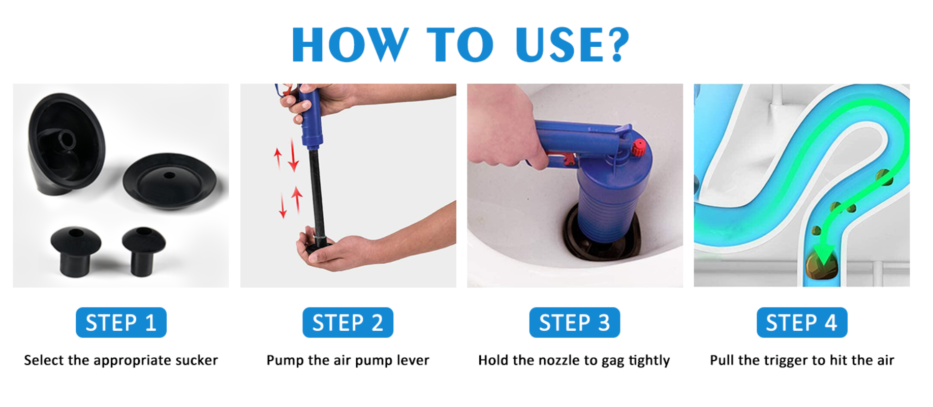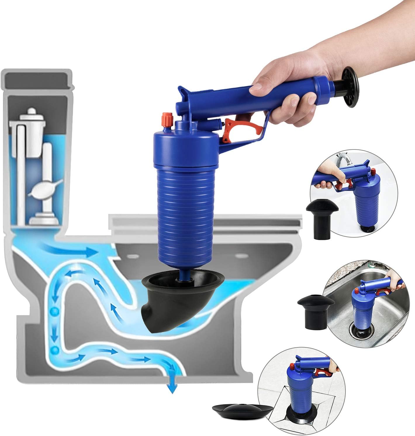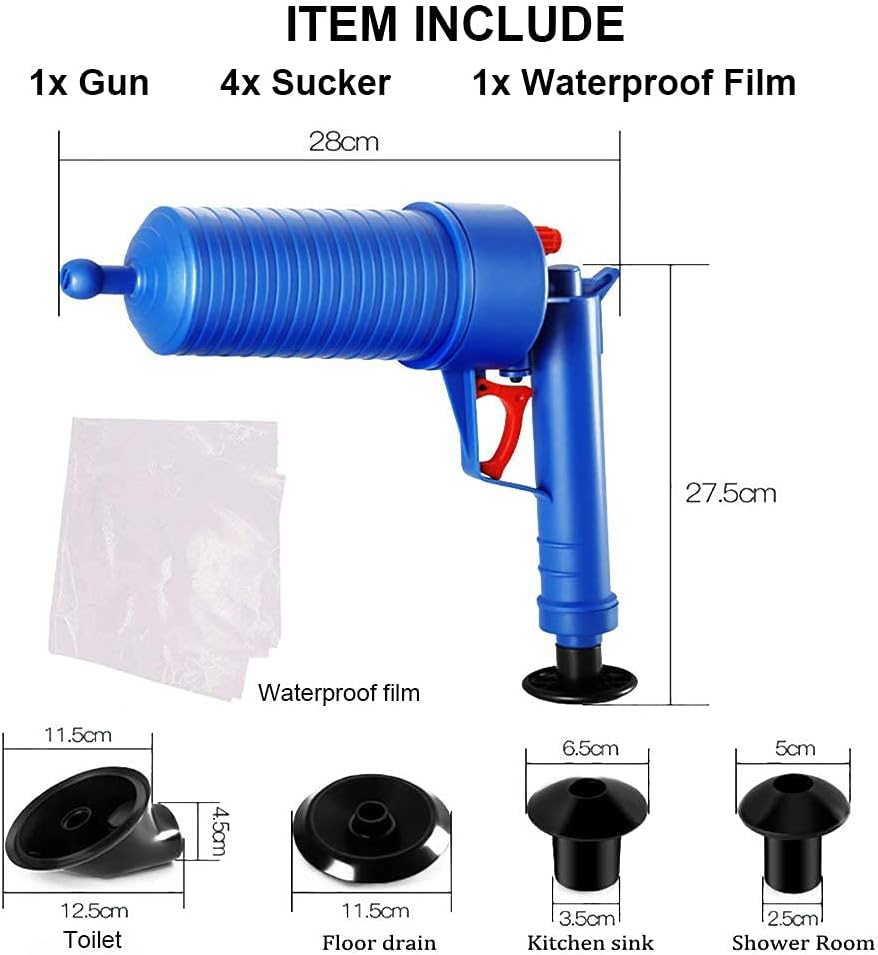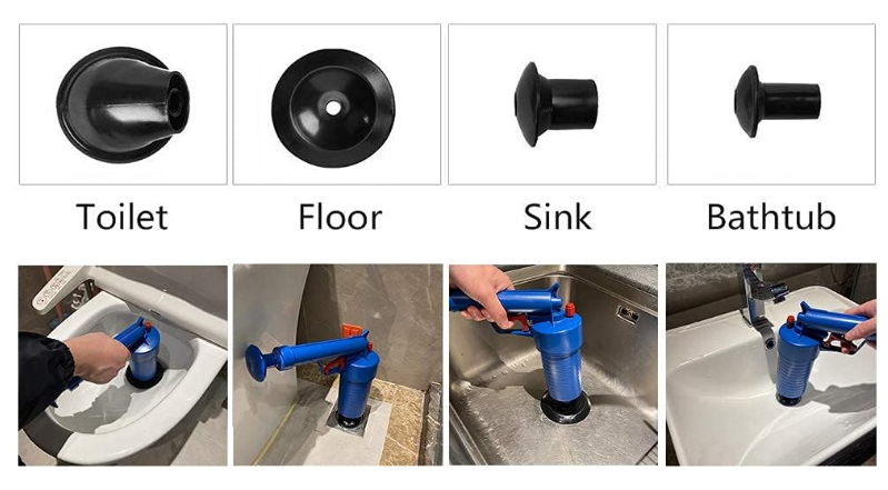 Complet Echipat: Pompa cu presiune de curatare este dotata cu ventuze de 5 cm, 6 cm, 11,5 cm, 4,3 cm-11,5 cm, in 4 dimensiuni, poate fi folosita in toalete, chiuvete, cazi de baie, dusuri, chiuvete, toalete turcesti, scurgeri de podea, tevi blocate, etc. Poate face fata tuturor tipurilor de blocaje cauzate de gunoi, par, tesaturi, ceai, frunze, grasime, ulei, etc. Cu ajutorul pneumaticii cu presiune ridicata, poate curata scurgerile rapid si usor. Ideal pentru lucrul pe chiuvete, cazi de baie si toalete.