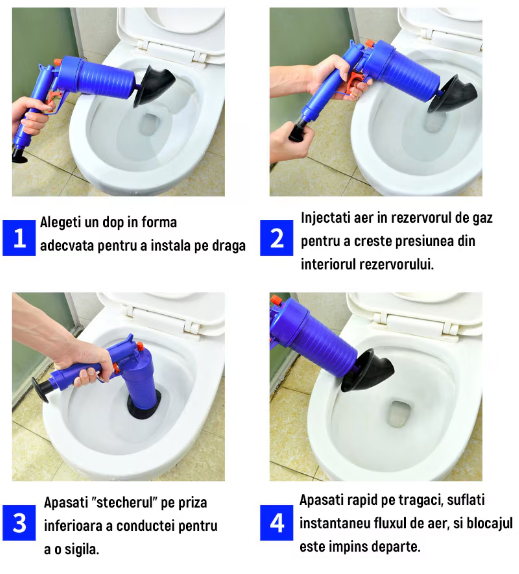 Design cu Presiune Ridicata: Pompa de aer pentru curatarea scurgerilor foloseste puterea aerului comprimat la presiune ridicata pentru a indeparta rapid si usor cele mai persistente blocaje. Mai eficient decat serpii traditionali.