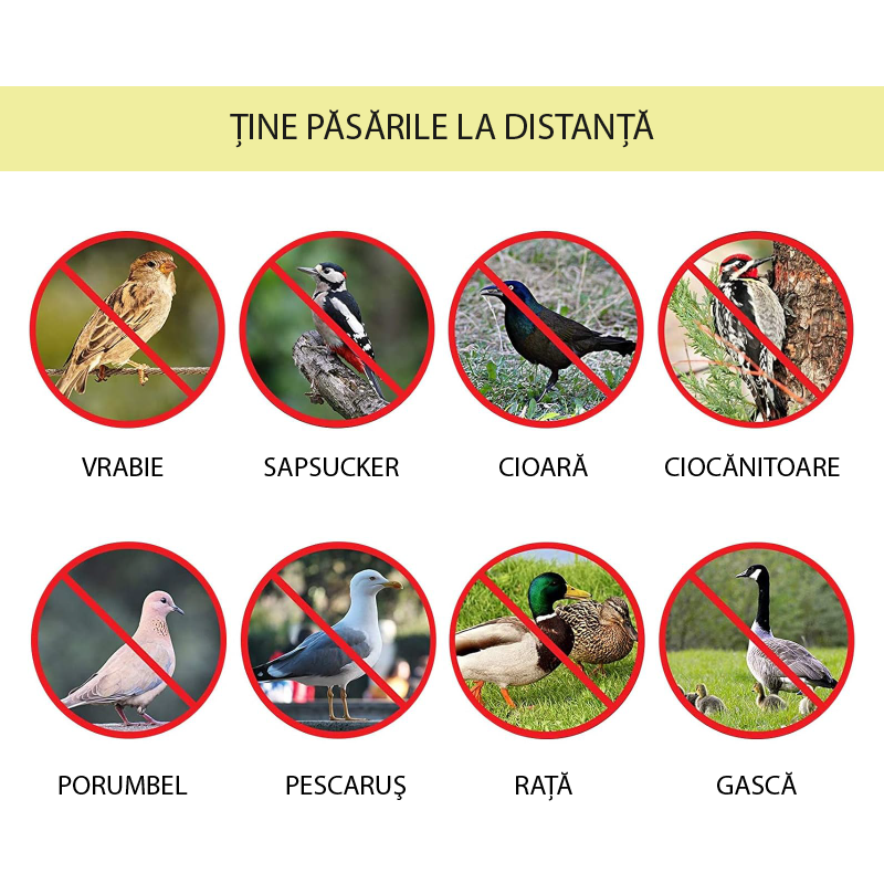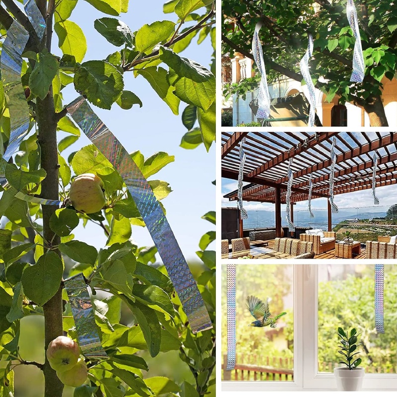 Ideala pentru alungarea porumbeilor, vrabiilor, ciocanitorilor, ciorilor si altor pasari nedorite. Protejeaza proprietatea, gradina, locuinta si culturile. Banda poate fi folosita si ca decor pentru casa, curte, gradina sau proiecte DIY.