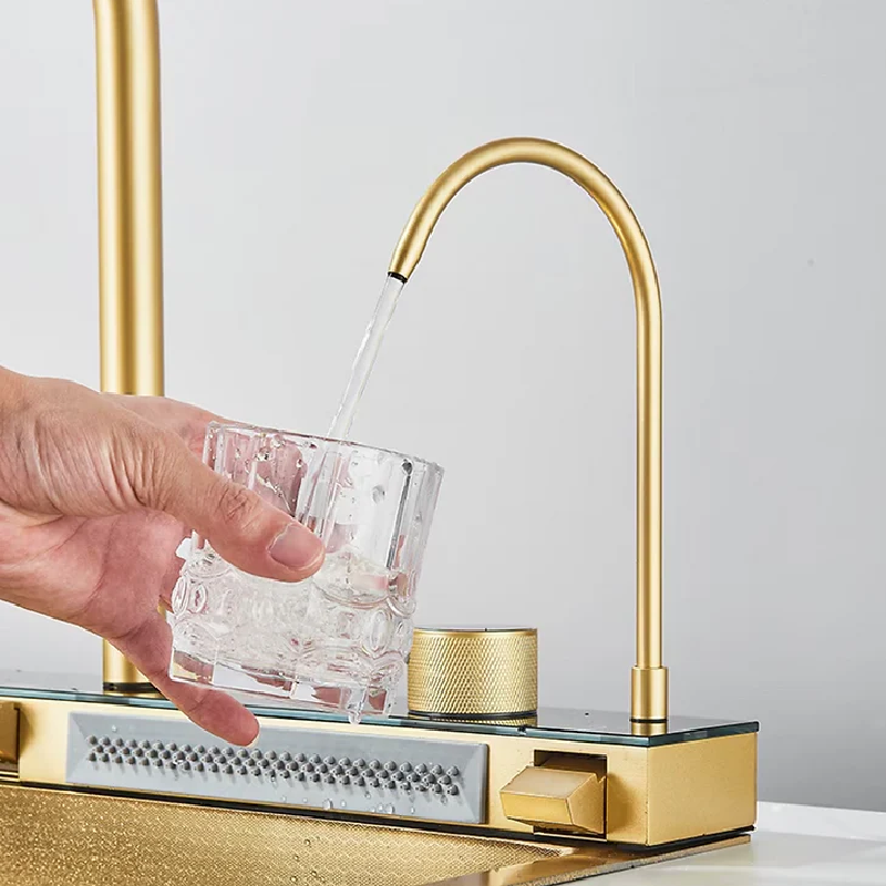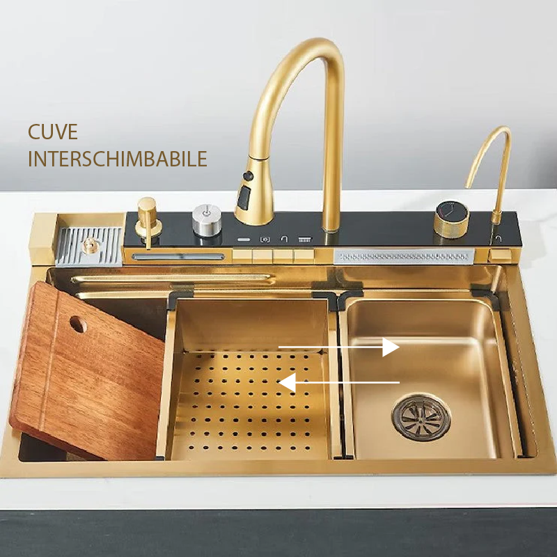 Chiuveta Multifunctionala SUPER TRENDS® Pentru Bucatarie cu 2 Cascade, Accesorii Incluse, Afisaj Digital Pentru Temperatura si Robinet Cascada, Culoare Gold, 750x460x220mm