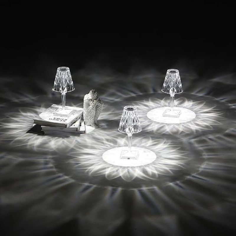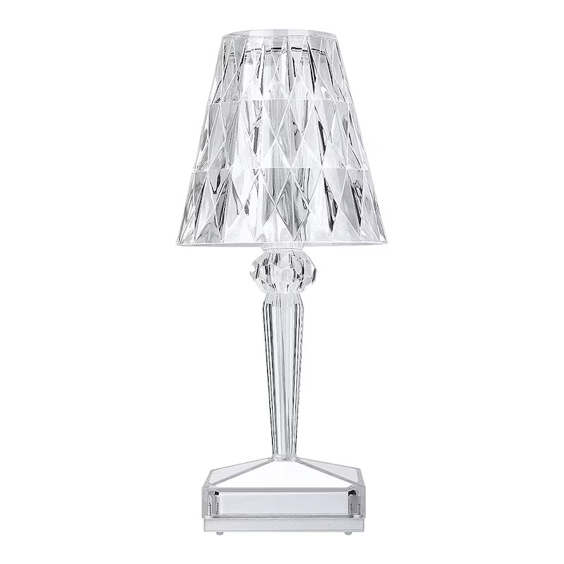 Lampa de masa cu design elegant tip diamant, realizata din acril transparent slefuit, ofera un efect de lumina spectaculos si romantic. Dotata cu comanda tactila si functie de schimbare a culorilor, este ideala pentru dormitor, sufragerie, birou, bar sau evenimente speciale.