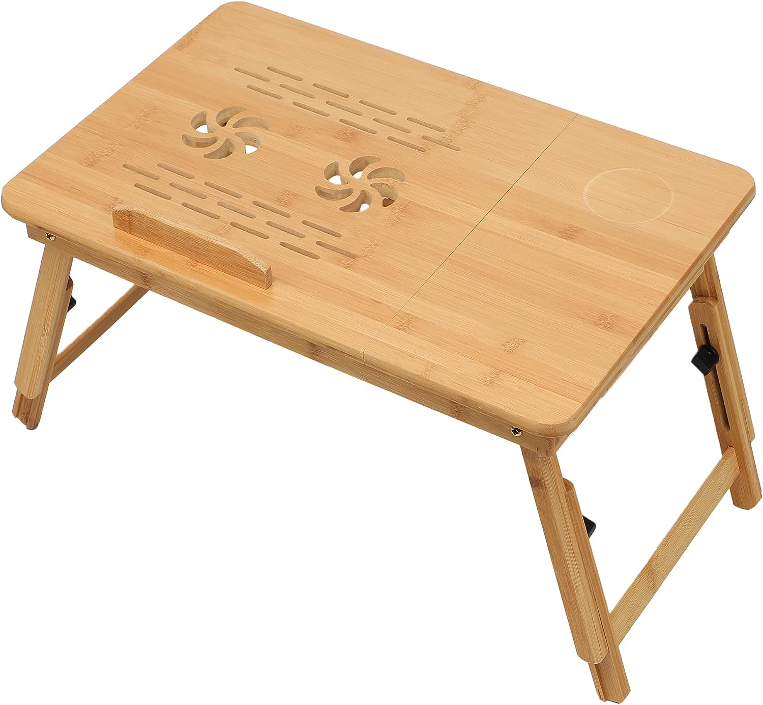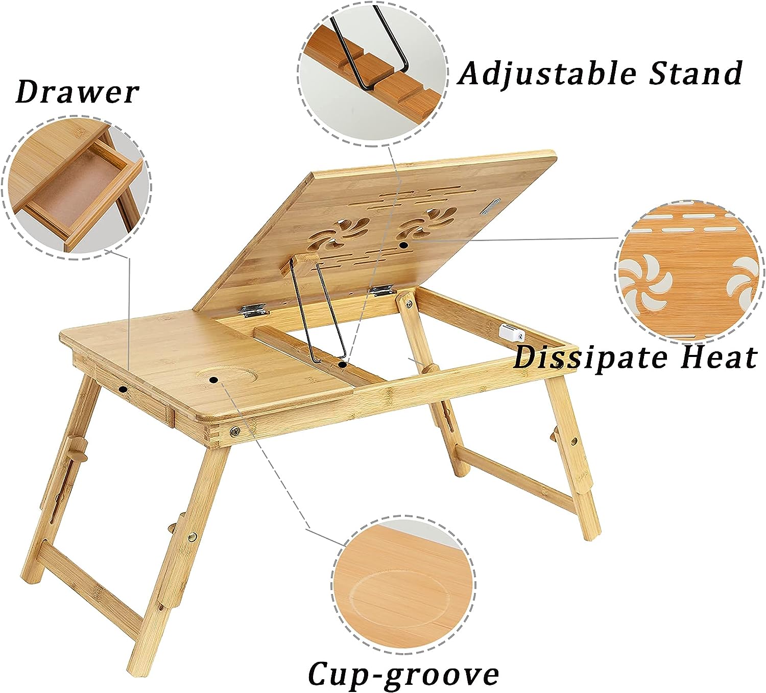 Design ergonomic - Masa de laptop pentru pat are un design pliabil pentru depozitare rapida si comoda. Include si un sertaras pentru stocarea cablurilor USB, a stick-urilor de memorie, a notitelor, a stilourilor sau a telefonului. Un opritor previne alunecarea tabletei/laptopului, exista si o adancitura pentru tinerea unei cani, precum si o fante pentru cablurile ventilatorului, ceea ce o face foarte potrivita ca o masa pentru laptop.
