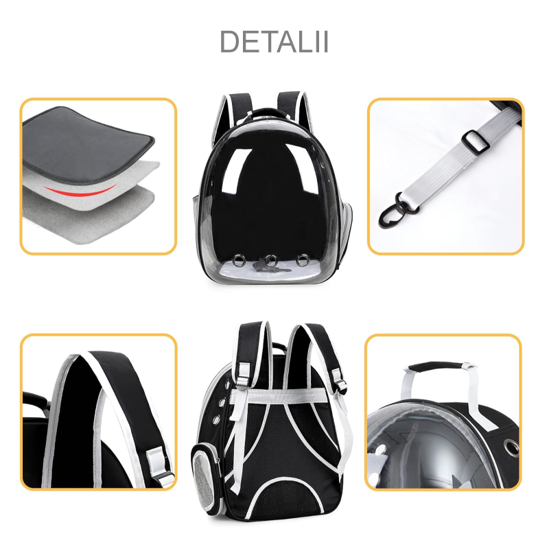 2. Designul transparent permite animalului de companie sa vada soarele si peisajul din exterior. Exista mai multe orificii de ventilatie pe lateralul rucsacului pentru a asigura o circulatie suficienta a aerului, permitand animalului sa respire confortabil.