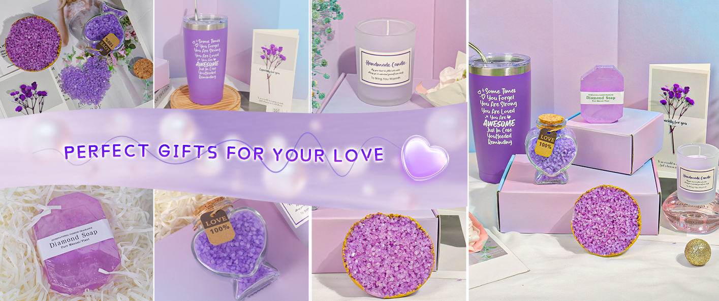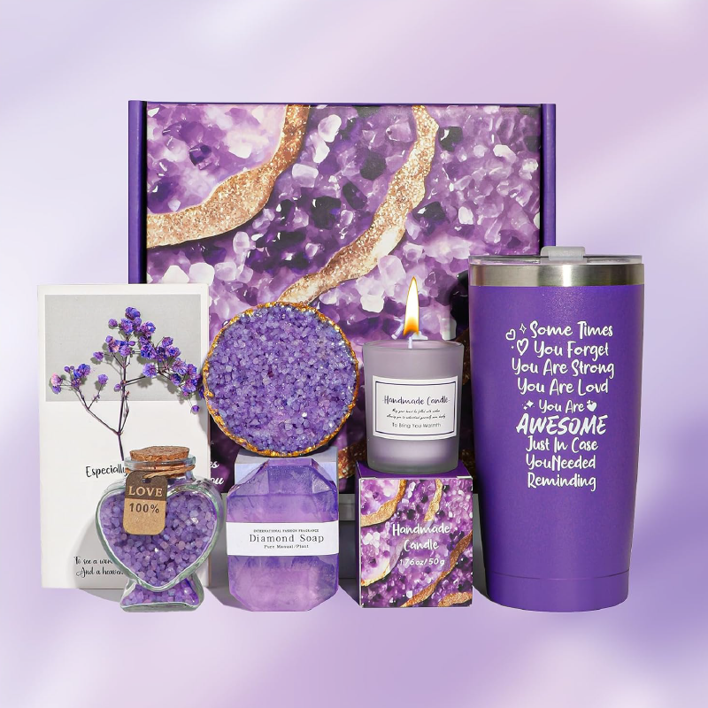Set Cadou SPA Pentru Femei SUPER TRENDS®, 6 Piese, Cutie cadou, Cana Termos Din Inox, Lumanare Parfumata, Sare de Baie, Sapun, Bila Efervescenta Baie, Felicitare, Mov