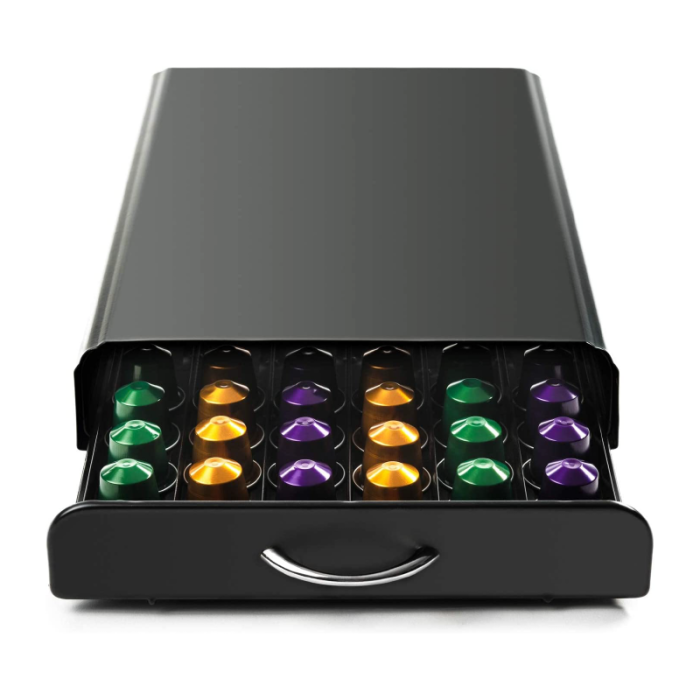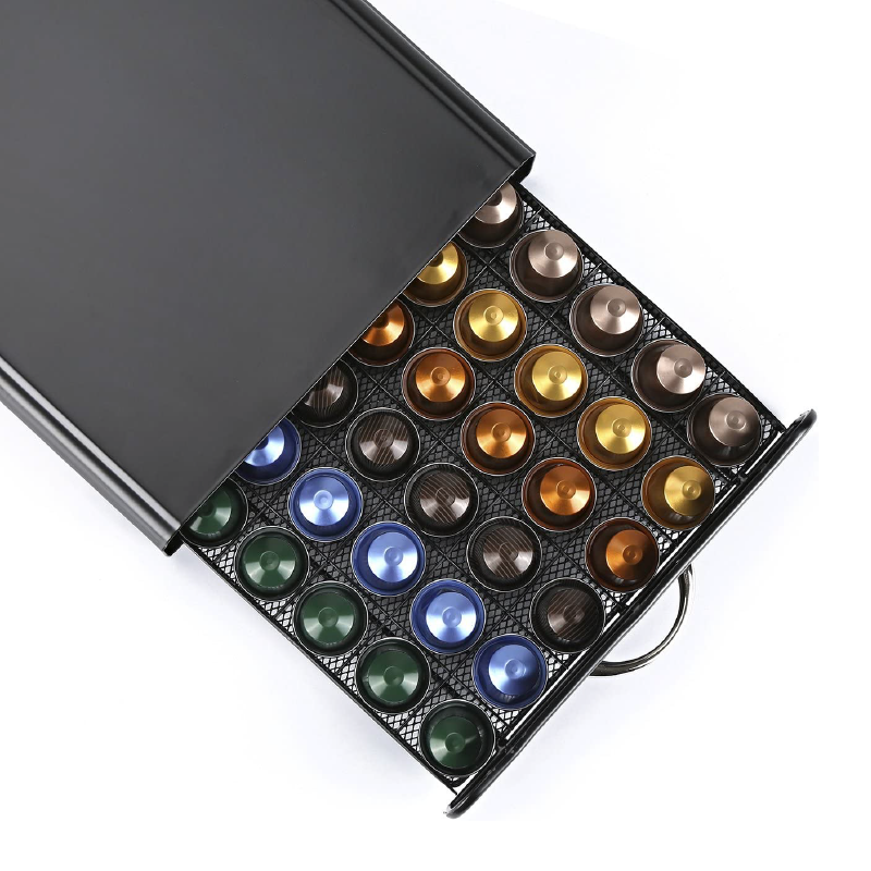 CALITATEA CONSTRUCTIEI – Sertarul este fabricat din material de fier rezistent. Poate sustine greutatea unui aparat de cafea asezat deasupra. Prin urmare, are un design care economiseste spatiu. La baza sunt prevazute paduri antiderapante pentru a proteja suprafata mesei. Rezistent la apa, pentru a pastra capsulele uscate si protejate.