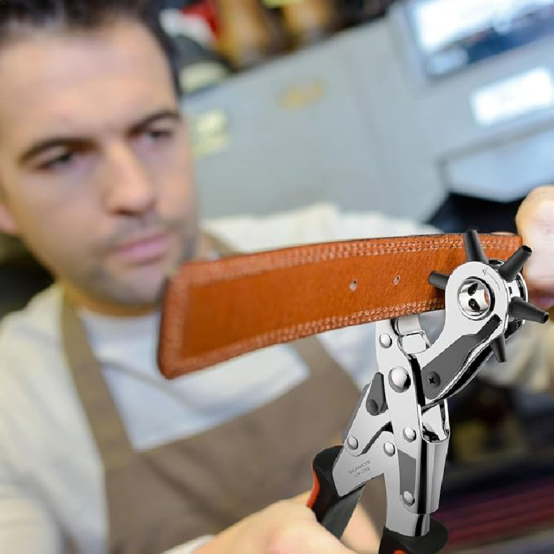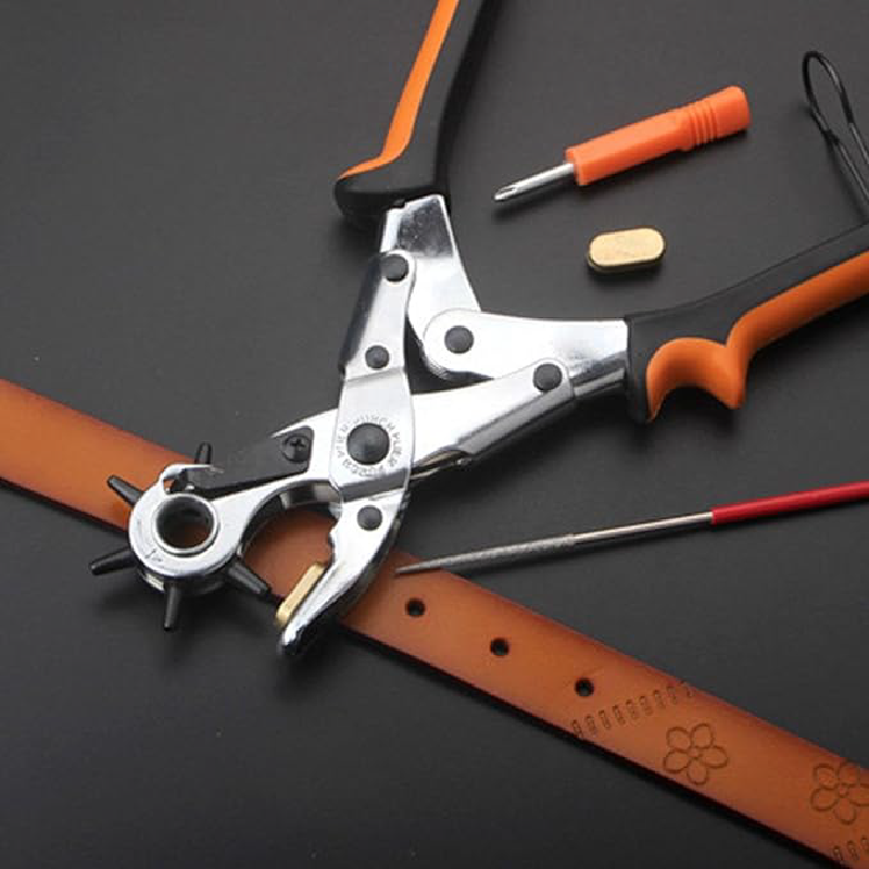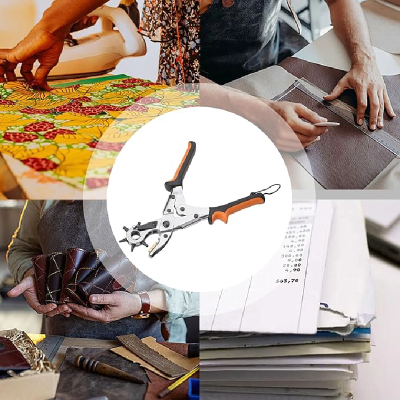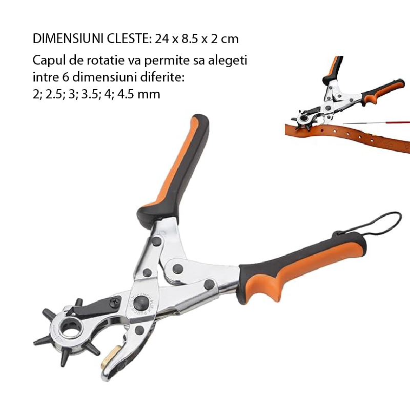Perforatorul rotativ cu 6 gauri are cele mai comune 6 dimensiuni, permitand realizarea precisa a gaurilor rotunde. Clestele perforator este folosit pe scara larga pentru a face gauri rotunde in piele, curele, material textil, plastic etc. Este deosebit de util ca perforator pentru piele.