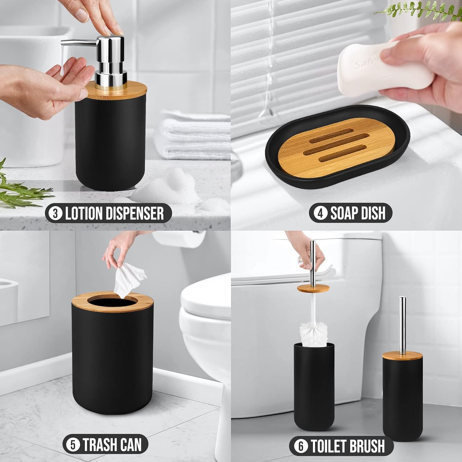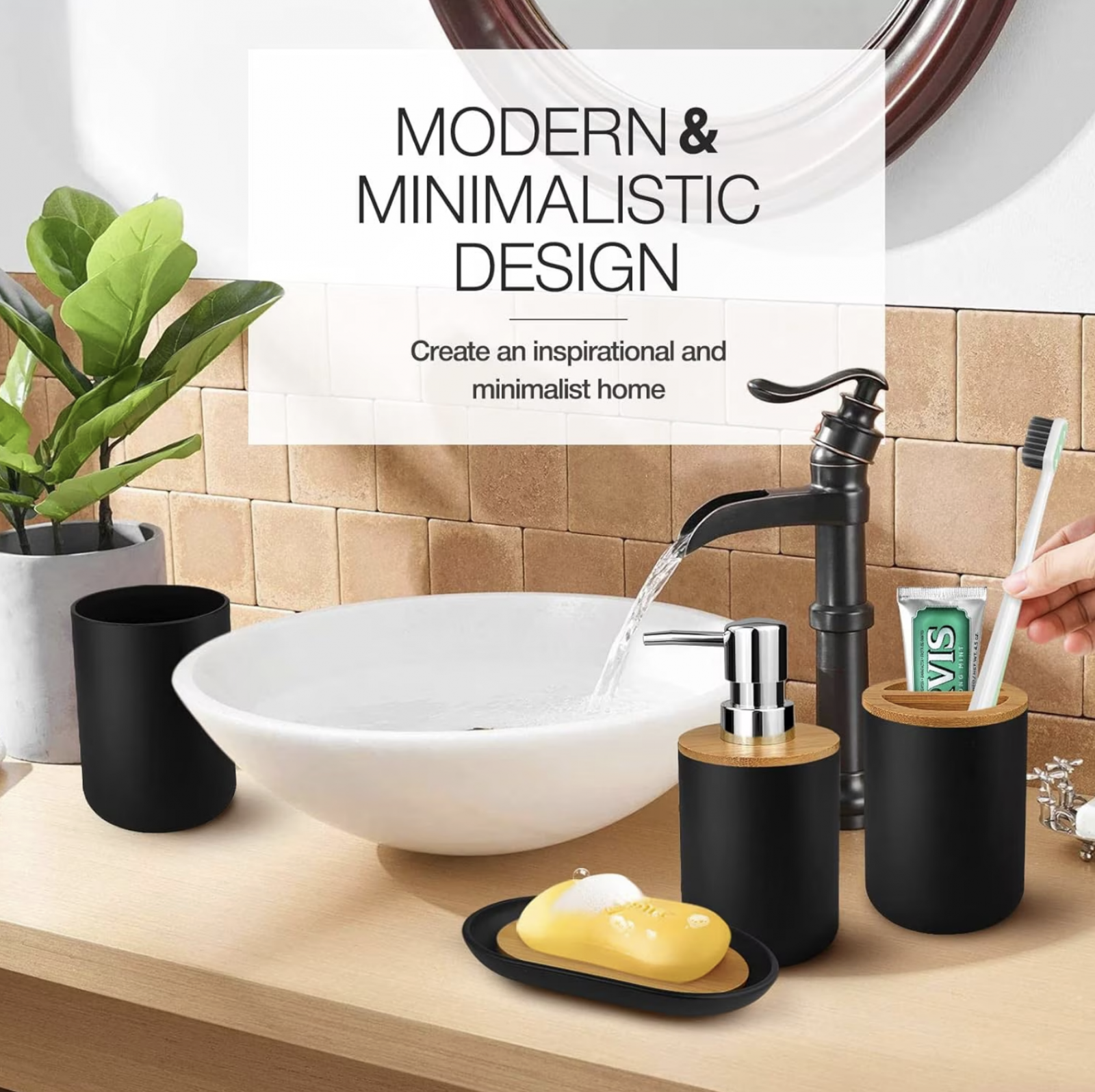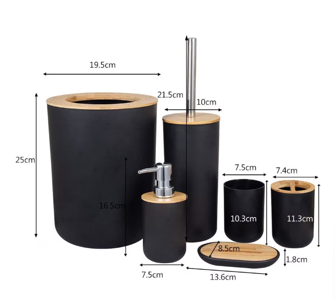 Materiale de inalta calitate: Setul pentru baie este realizat din bambus natural si plastic ABS de inalta calitate, oferind rezistenta si durabilitate in timp. Bambusul adauga un aspect elegant si rafinat, perfect integrat in decorul modern al baii tale. Materialele sunt durabile si anti-soc, asigurand utilizarea pe termen lung, iar dozatorul de sapun lichid este echipat cu o pompa din plastic dur, care previne scurgerile si functioneaza eficient.