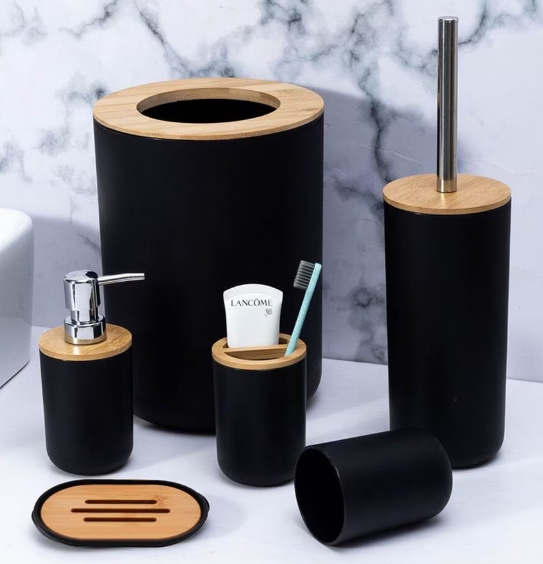 Set complet de accesorii pentru baie - 6 piese: Acest set include tot ce ai nevoie pentru a-ti organiza si decora baia. Setul contine 1 suport pentru periute de dinti, 1 pahar pentru periute, 1 dozator de sapun lichid, 1 suport pentru sapun solid, 1 suport pentru peria de toaleta si 1 cos de gunoi. Culoarea acestui set de accesorii pentru baie este sofisticata si poate fi combinata usor cu orice decor.